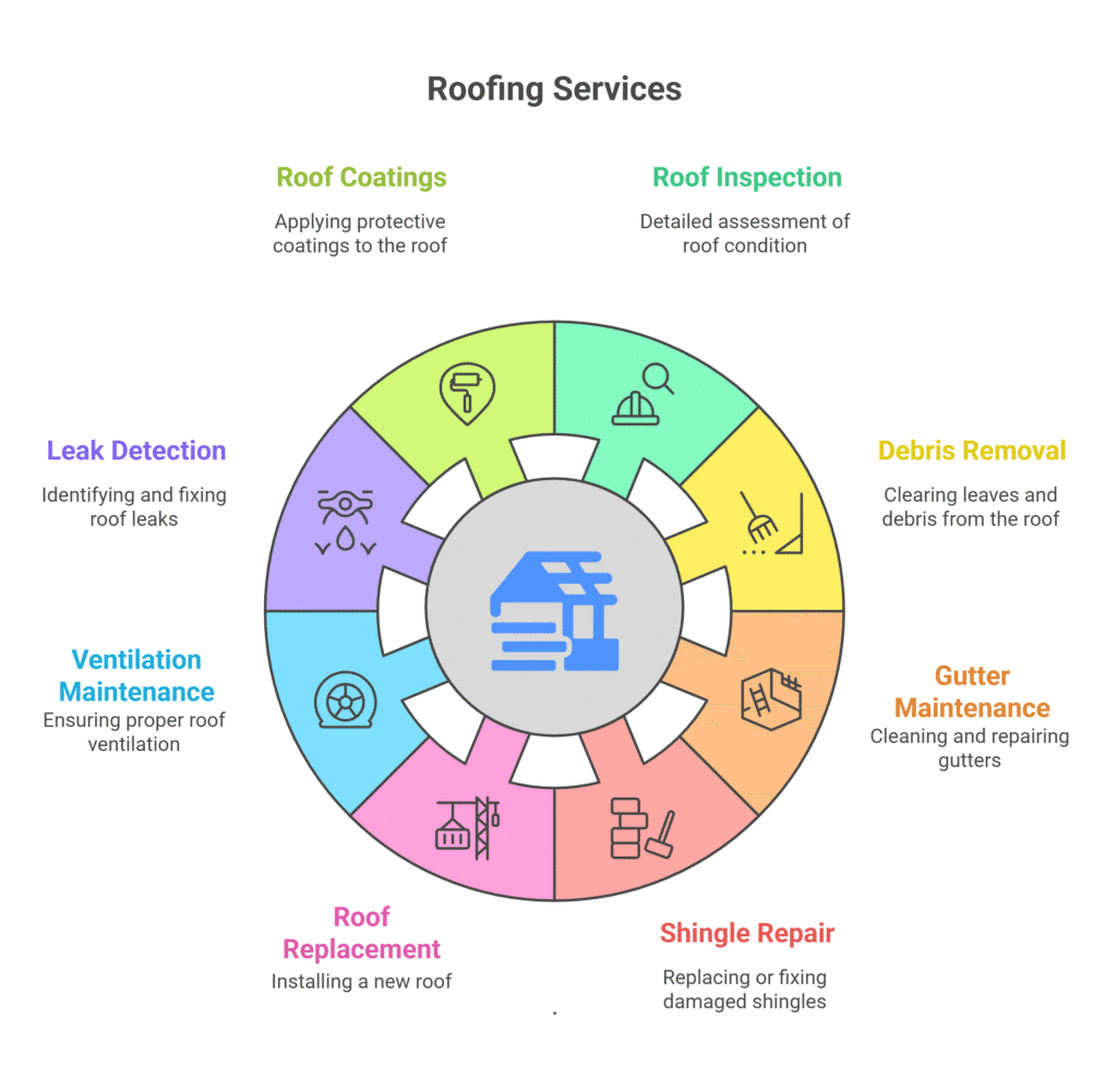 Your roof needs regular care to stay strong and leak-free. This includes cleaning gutters, checking for missing or damaged shingles, inspecting flashing, removing debris, and sealing small cracks. Seasonal inspections help catch problems early and keep your roof lasting longer.